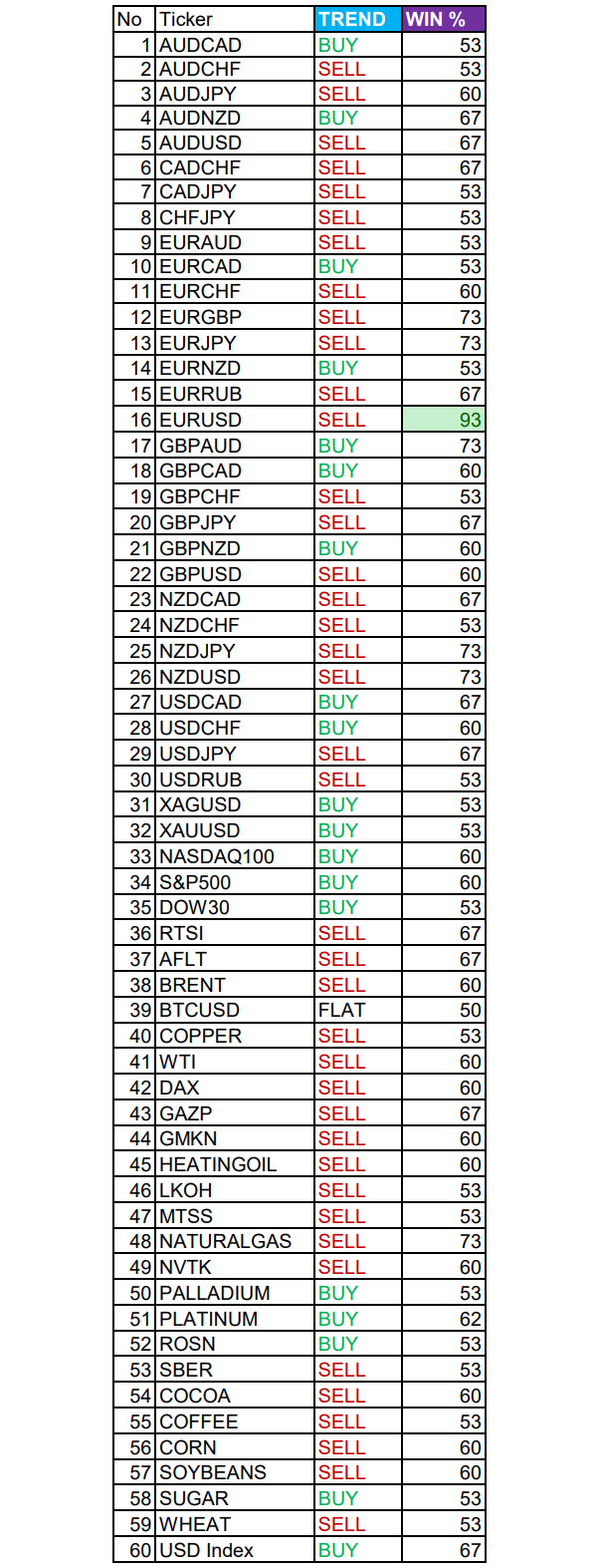 Весь перечень анализируемых активов указан ниже в общем количестве 60 инструментов. Здесь Вы найдете активы рынка Форекс, популярные активы Московской биржи, не менее популярные активы Чикагской биржи СМЕ и мажор криптовалютного сегмента - Биткоин, за которым следуют все альткоины.