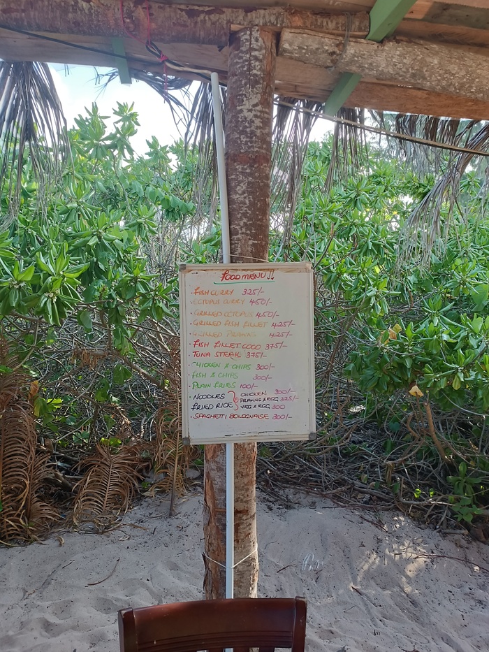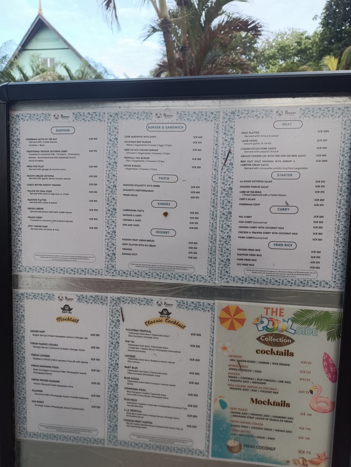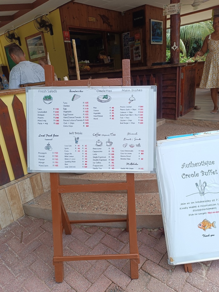 Питание в заведениях на Сейшелах дорогое. В рублях=рупия*6.