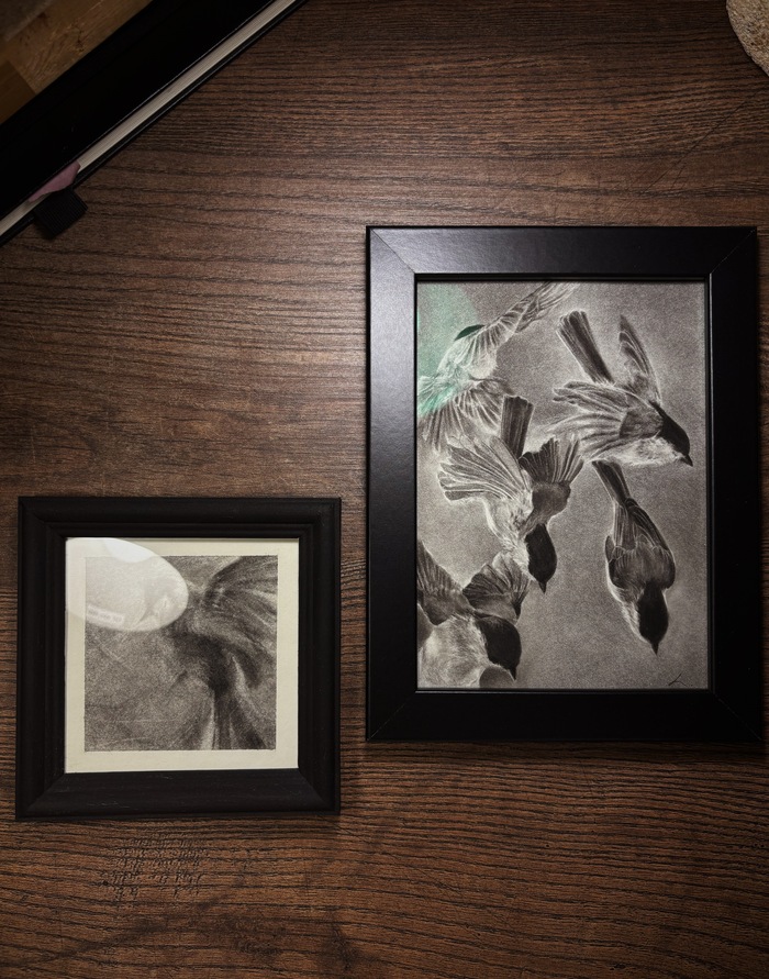 Все по классике: бумага, уголь. А также техника, смешанная с кофейком и наблюдениями за пухляками-вертолетами, таскающими семечки :)