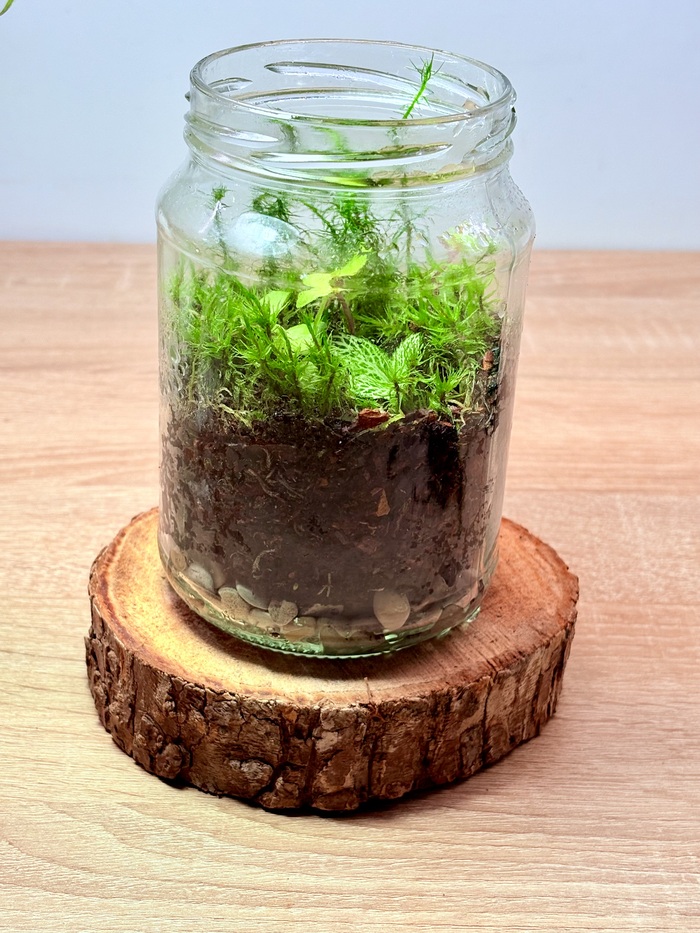 Уход для закрытой банки довольно прост: нужно периодически проветривать, подрезать растения по мере их роста и изредка опрыскивать, когда грунт просох. Обычно такие флорариумы живут очень долго, если технология сборки правильная