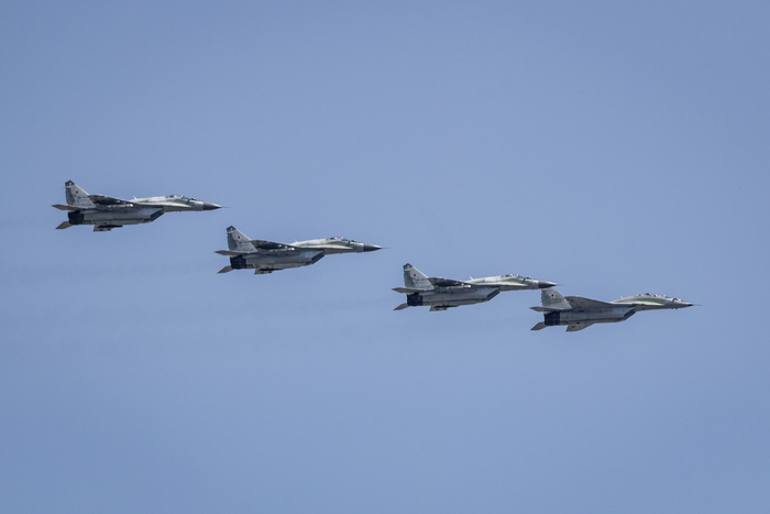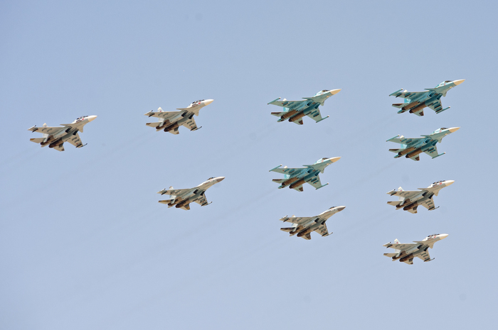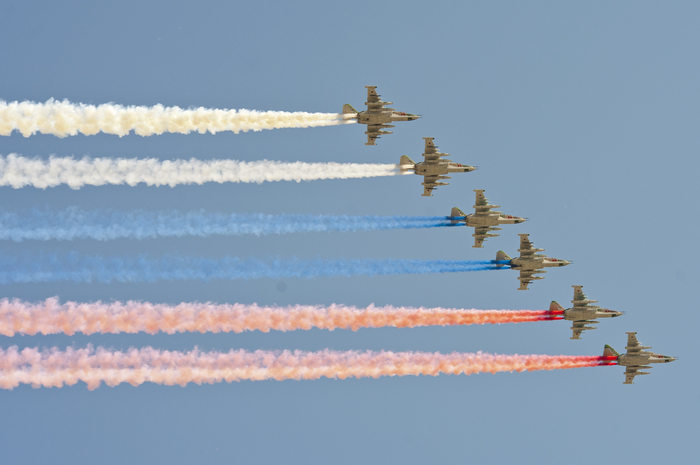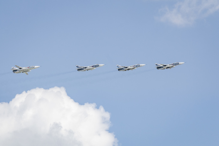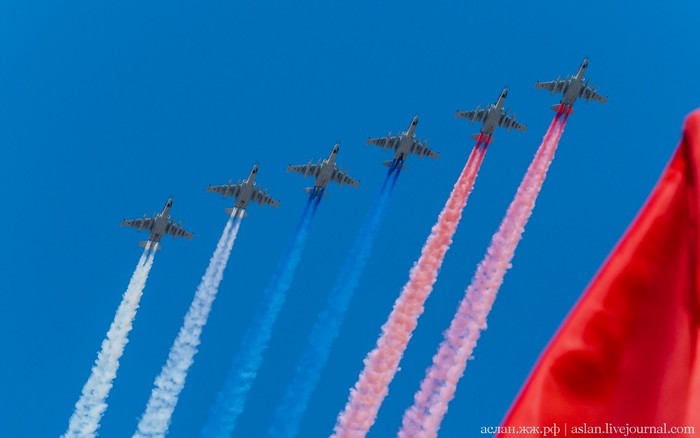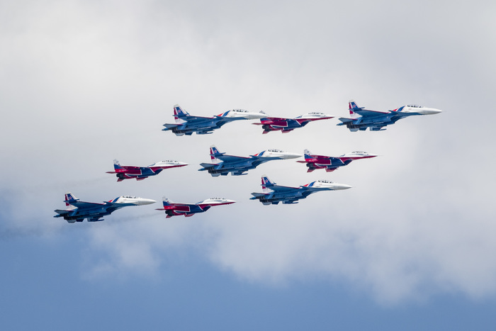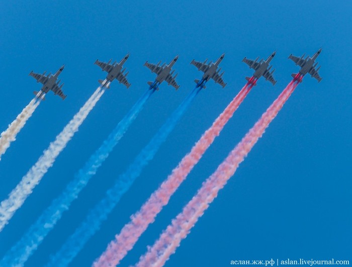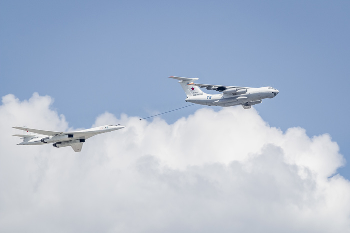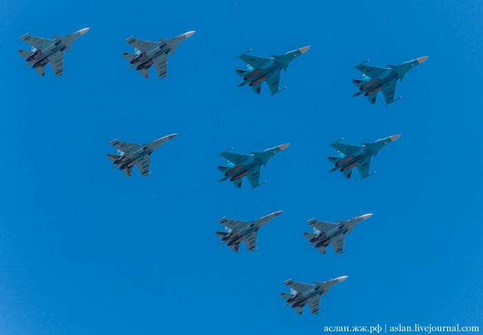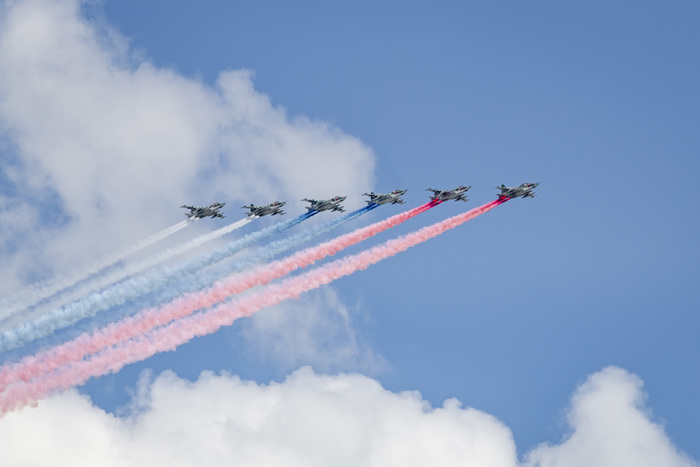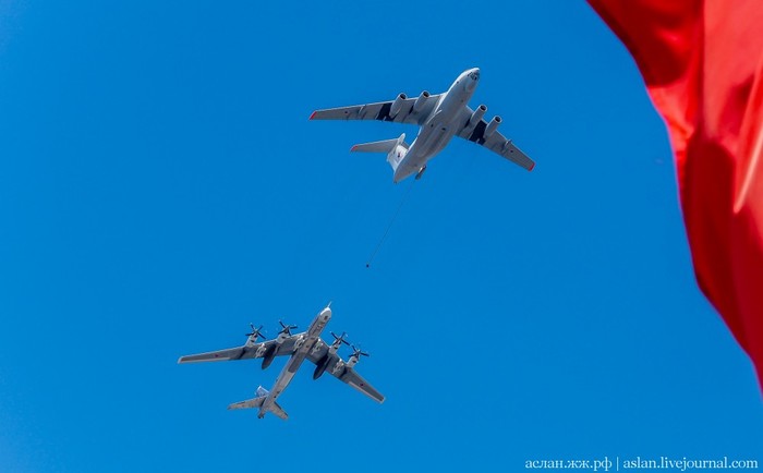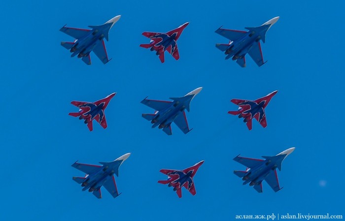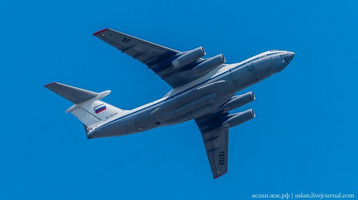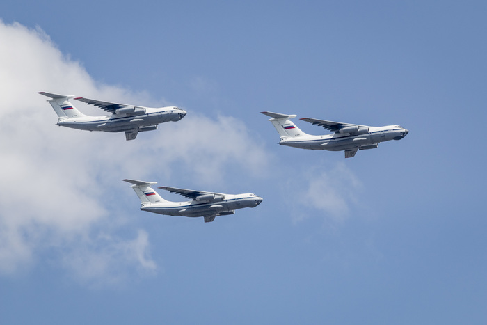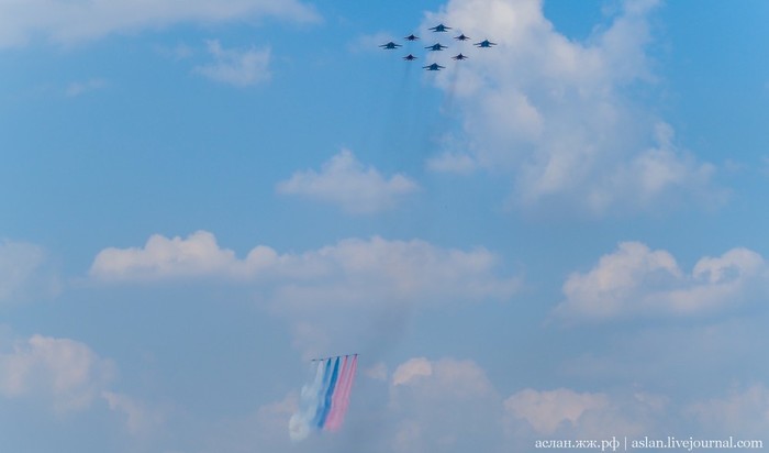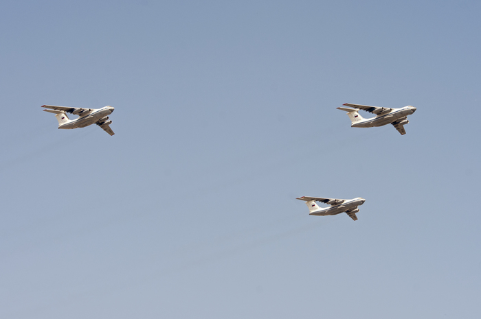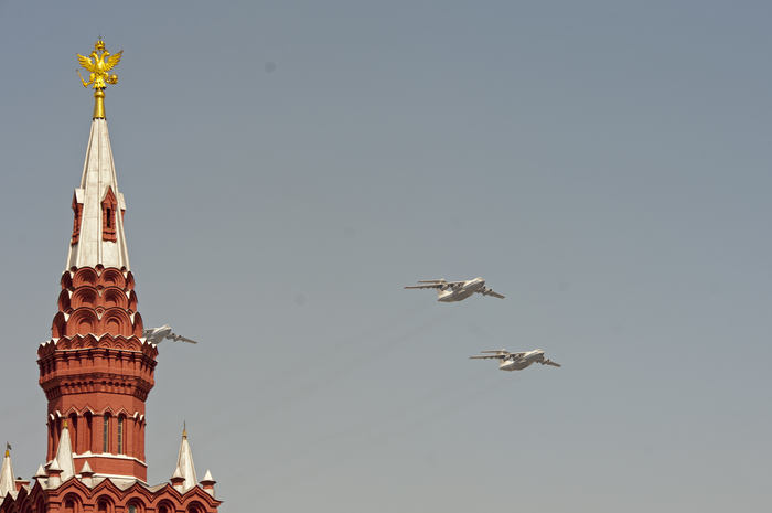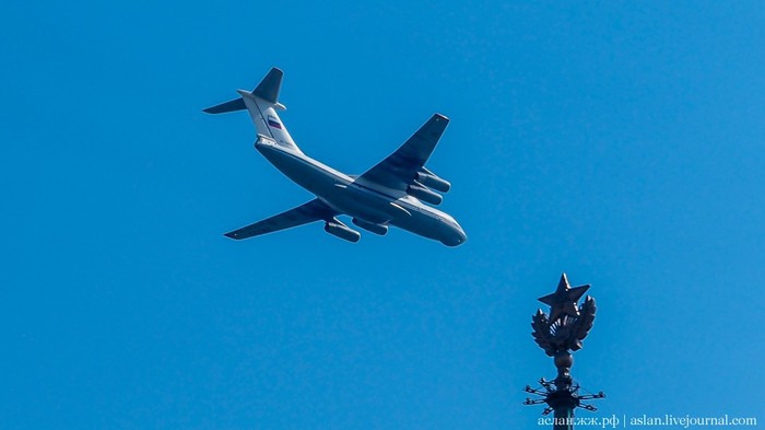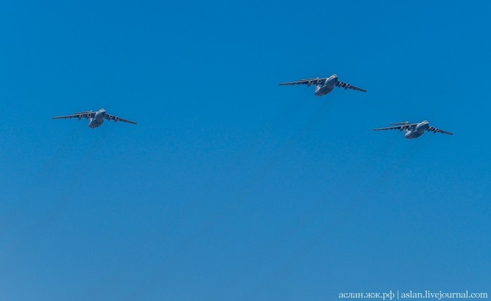 Военно-транспортную авиацию должны были представить самолеты Ил-76 и топливозаправщик Ил-78. Кроме того, в небе столицы появились в едином строю пилотажные группы "Русские витязи" на истребителях Су-30СМ и "Стрижи" на МиГ-29.