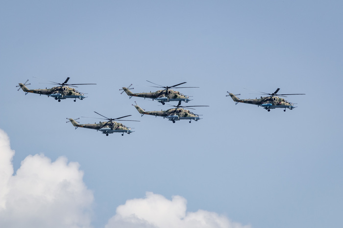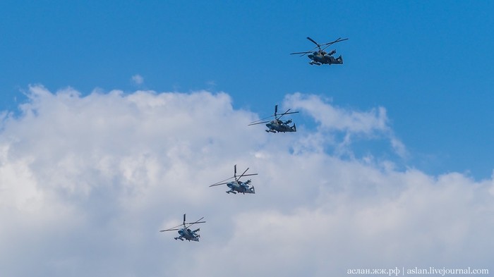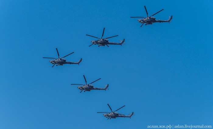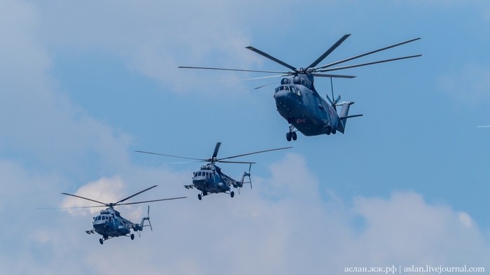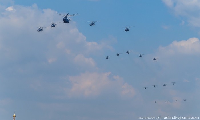 Я не считал, сколько единиц военной технили пролетело над головами столпившимися на Большом Устьинском мосту, где я в том числе наблюдал за полетами, но официальные источники говорят о 74 самолетах и вертолетах оперативно-тактической‚ дальней, военно-транспортной и армейской авиации.