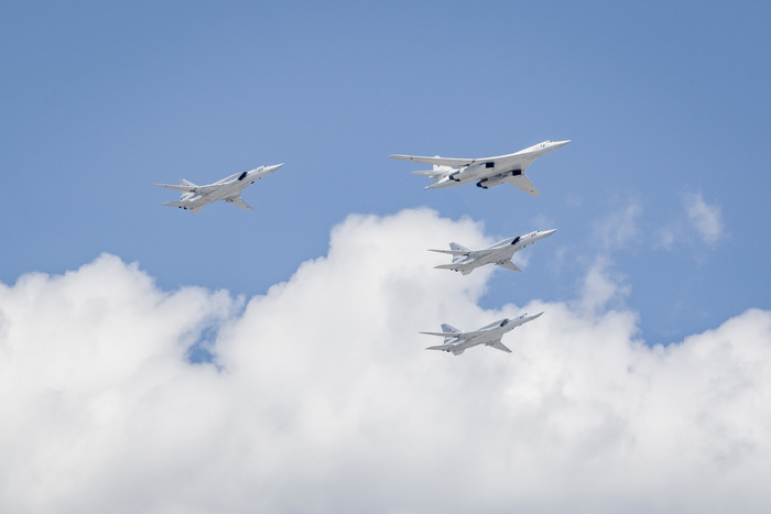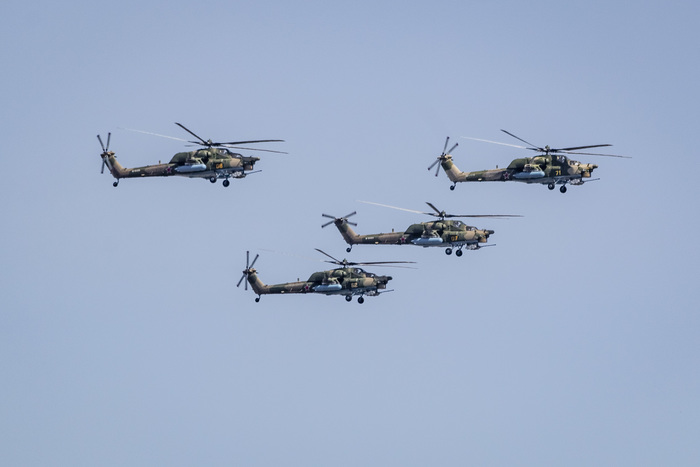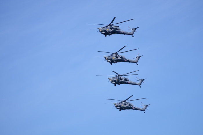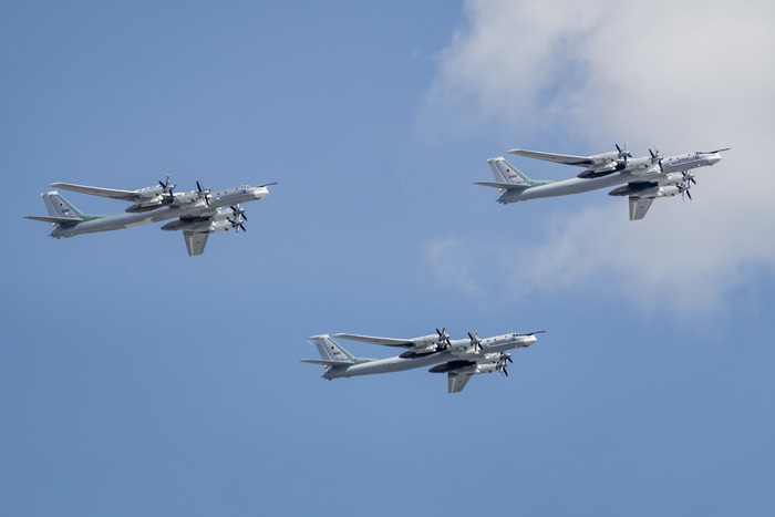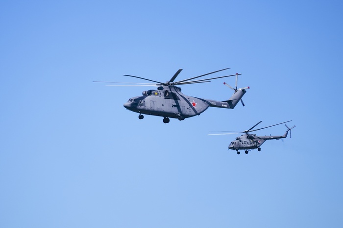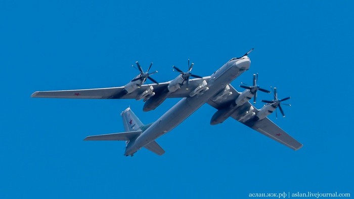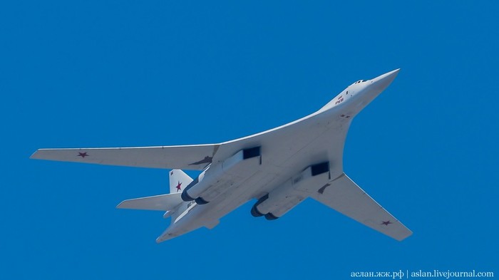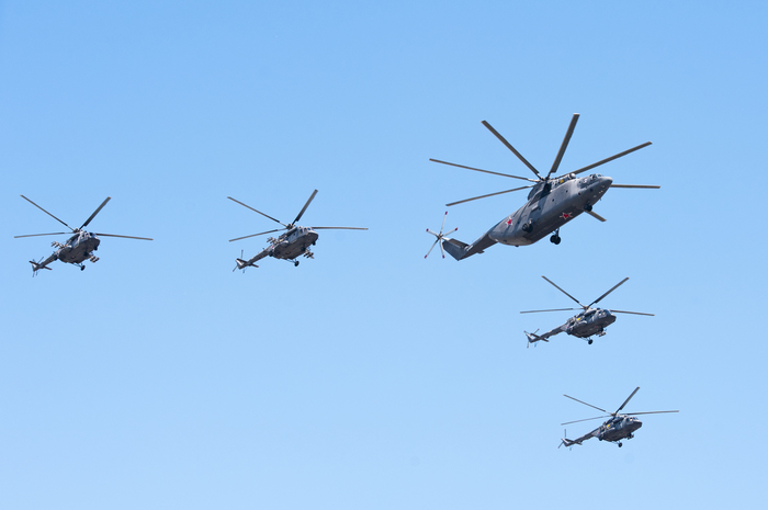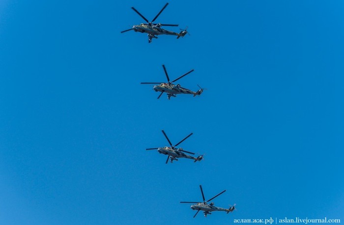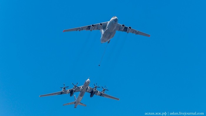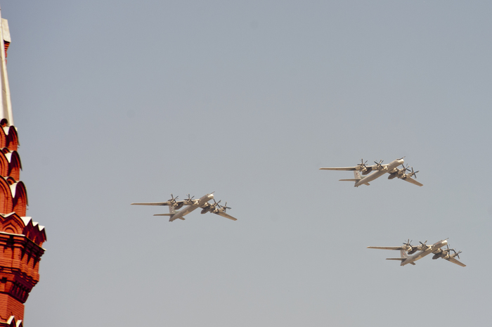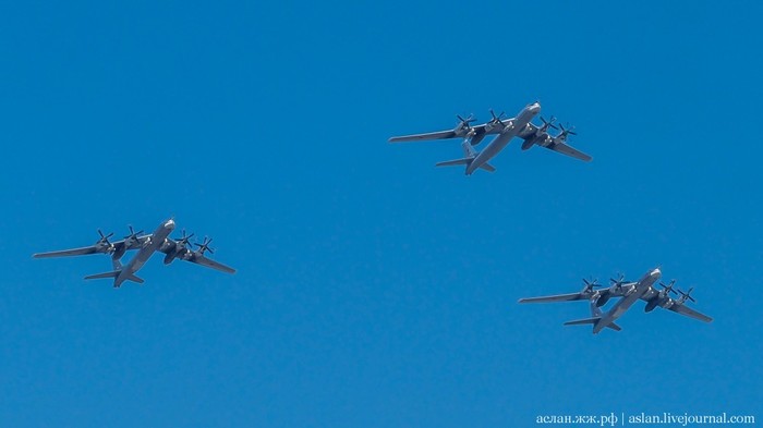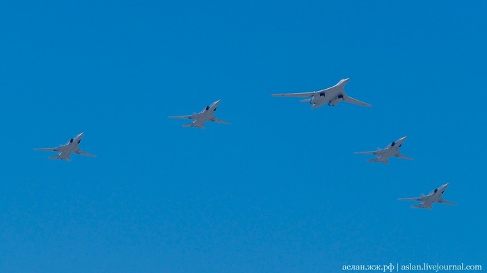 В авиационной части парада должны были участвовать вертолеты Ми-26, Ми-28НМ, Ка-52, Ми-35, а также модернизированные стратегические бомбардировщики Ту-95МСМ, стратегические ракетоносцы Ту-160 и бомбардировщики Ту-22М3, которые можно увидеть ниже.