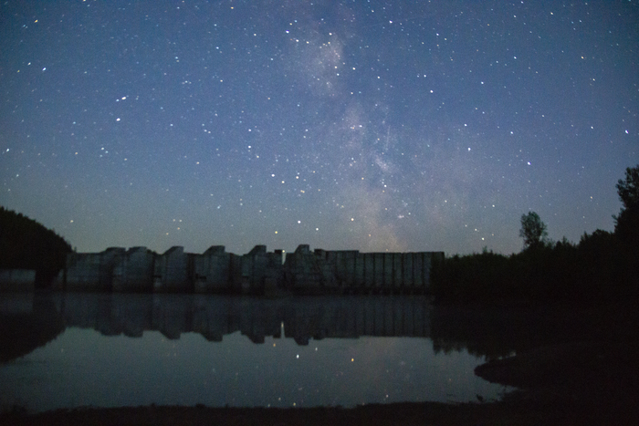 Млечный путь на фоне Верхне-Араслановской недостроенной плотины смотрится во тьме как потерпевший крушение космический корабль. К сожалению на фото я не смог передать этого.