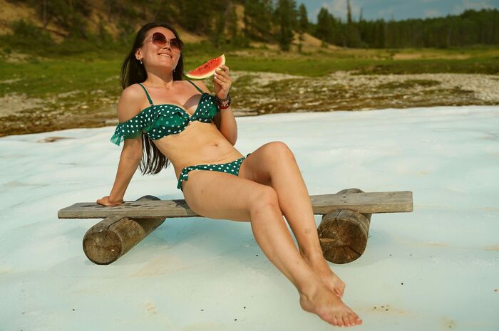Кстати, большинство ученых считает, что уже к середине этого века в тёплое время года Арктика будет свободна ото льда. А к уже к концу века и зимой льда там почти не будет... Но девушек Заполярья не испугать ни жарой ни холодом. Почему бы и не позагорать в купальнике и босиком на льду? Представляю небольшую тематическую фотосессию: История из жизни