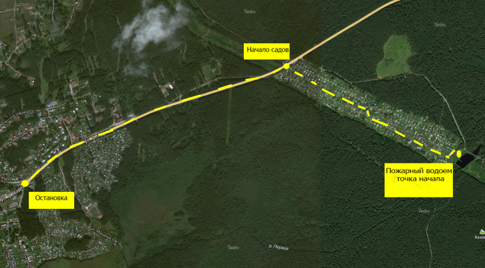 Доехав до конечной станции нужно пройти еще вдоль трассы порядка 2 км до садов (не переходите дорогу, по вашей стороне будет лесная тропинка до самых садов).