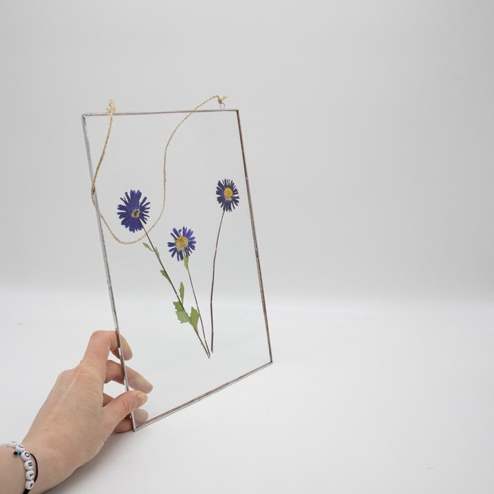 Небольшие элементы из витражного стекла я еще помогаю вырезать, а вот гербарии он делает уже профессионально и лучше меня. Вот одна из последних его работ - альпийская астра в стекле.
