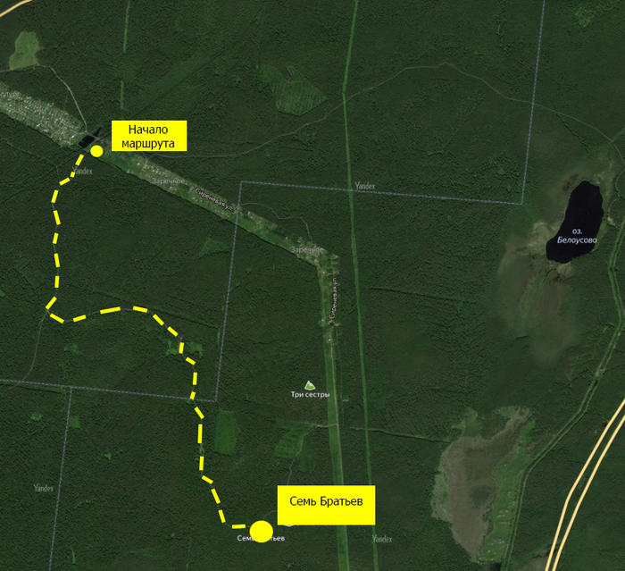 Чтобы направиться к Семи Братьям от пруда нужно повернуть направо и пойти по дороге. Заблудиться здесь невозможно — пусть помечен, да и дорога всего лишь одна. По дороге есть беседки, чтобы присесть и отдохнуть.