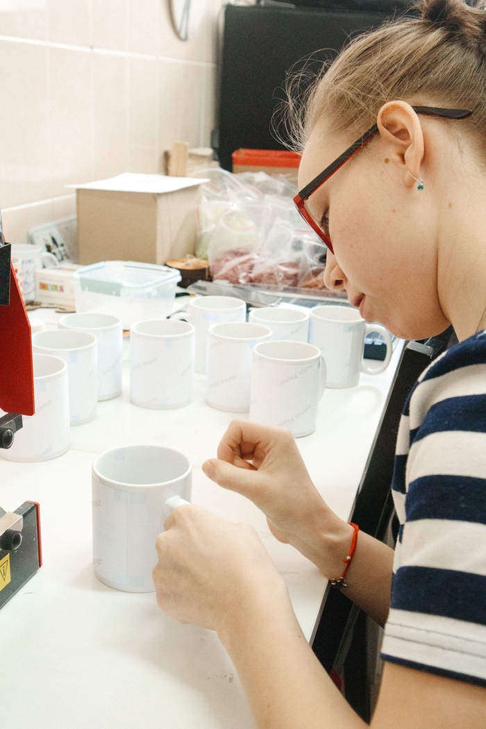 Лена пока обучается печати на кружках и ей это очень нравится.