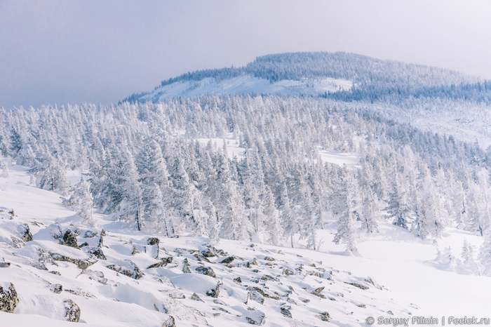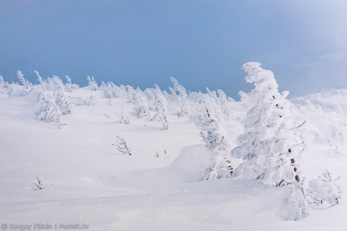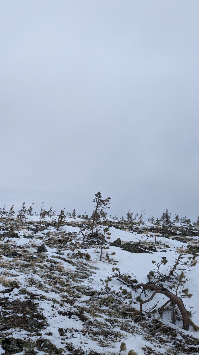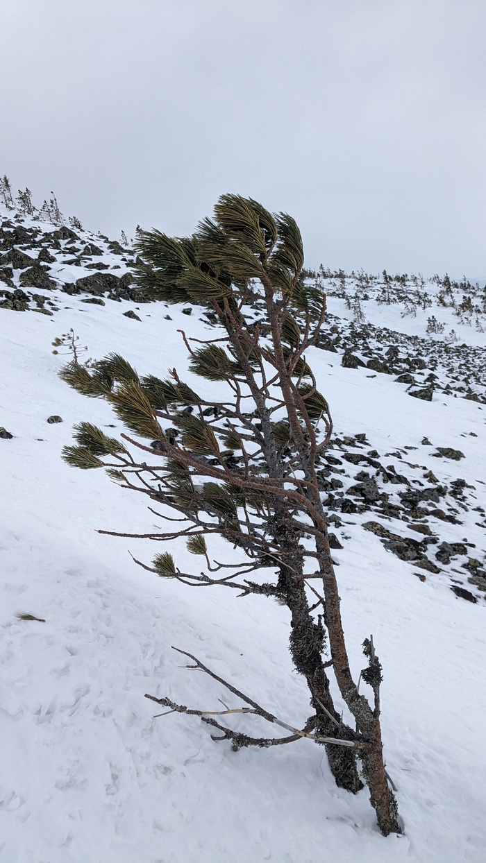 Если повезёт с погодными условиями, здесь можно увидеть потрясающе красивые заснеженные ёлки. Выглядеть это должно было как в сказке, но нам не повезло - ёлки как ёлки. Кроме того, что они становились все более и более невысокие ближе к вершине и закручивались в крендели ветром.