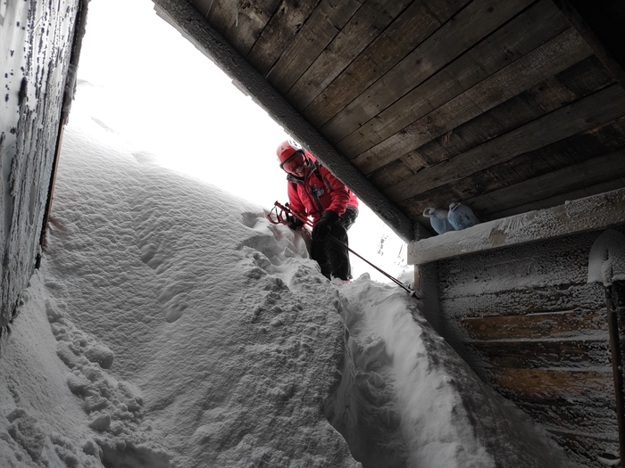 Гребем носочками ботинок (кто знает, что такое горнолыжные ботинки) и тяяянемся вперед, гребя руками к крыльцу. Оно слева.