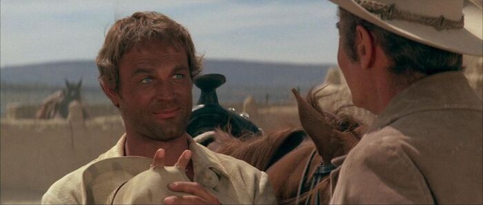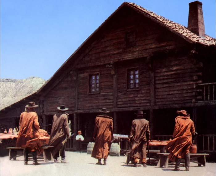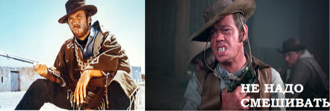 В спагетти-вестернах время от времени появлялись индейцы — «Джанго, стреляй...» («Если жив, стреляй», Se sei vivo spara; 1967, режиссер Джулио Квести) — и ковбои — например, в «командном вестерне» Франко Джиральди «Семь женщин Макгрегоров» (1967), название которого явно отсылало к «Великолепной семерке» (1960) Джона Стёрджеса. Правда, краснокожие и скотоводы возникали на испанском «Дальнем Западе», скорее, как исключение, но ведь они встречались и далеко не в каждом американском вестерне. Добавим, что, по словам Серджо Леоне, созданный Иствудом в «долларовой трилогии» образ человека из ниоткуда без прошлого во многом был вдохновлен классической лентой Джорджа Стивенса «Шейн» (1953). Все как будто указывало на мимикрию под продукцию made in USA.