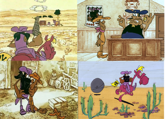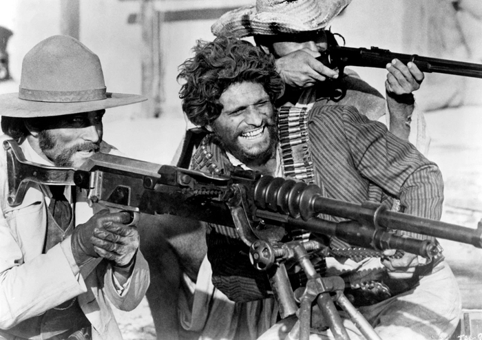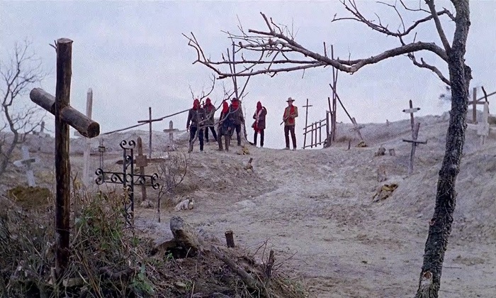 Даже там, где, казалось бы, Корбуччи оригинален и остроумен, последнее слово в заочном диалоге остается за Тарантино. Итальянский постановщик придумывает расистов в капюшонах цвета крови, которые преследуют представителей желтой расы. Вводя в повествование куклуксклановцев, американский режиссер следует историческим реалиям. Вроде ничего особенного, но, наблюдая за стенаниями плантаторов, сетующих на плохую видимость жертв через узкие прорези масок и обиду одного из них за «благородное» усилие его патриотичной супруги, которая «не жалея себя, шила всю ночь эти капюшоны с прорезями», вступаешь в зону черного юмора. Мотив Корбуччи развит, спародирован и достигает большего эффекта.