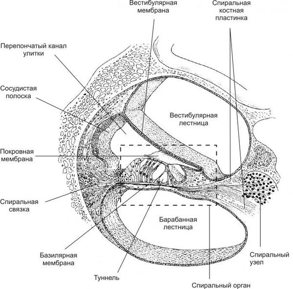 Звуковая волна попадает в наружный слуховой проход и бьет в барабанную перепонку. Она начинает колебаться и по слуховым косточкам вибрация переходит на мембрану овального окна. Колебания передаются перилимфе, начинают колебаться основная и мембрана Рейснера. От этого в движение приходит эндолимфа, которая воздействует на Кортиев орган. Волосковые клетки внутри органа при движении начинают генерировать электрический импульс, который по преддверно-улитковому нерву направляется в головной мозг.