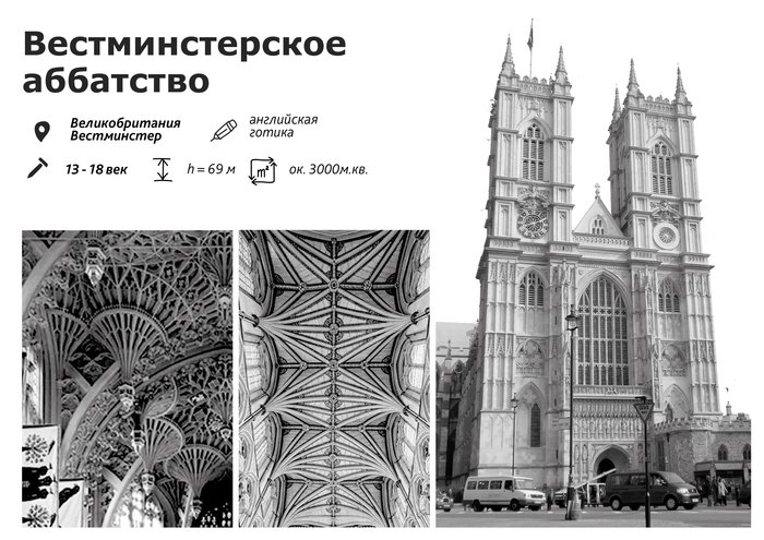 Еще один гениальный представитель английской готики (всех ее этапов) - Вестминстерское аббатство: каменные кружева перекрытий, пучкообразные своды, ланцетовидные (стрельчатые) окна, аркбутаны и остальные элементы высшего исполнения готического стиля. Объект находится в Списке всемирного наследия ЮНЕСКО.