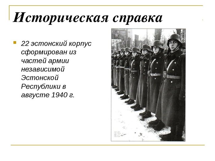П.С. Из интересного. Часть бойцов 22-го стрелкового корпуса- попавшая в плен ( освобождены немцами) , или добровольно перешедшие на сторону противника, или дизертировавшие из частей РККА, позже оказались в рядах 20-й добровольческой пехотная дивизии СС (1-я эстонская). И позже сражались со своими боевыми товарищами по июню- августу 1941 . который остались в рядах Красной Армии.