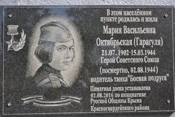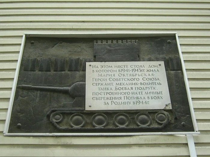 "На этом месте стоял дом, в котором в 1941—1943 годах жила Мария Октябрьская — Герой Советского Союза, сержант, механик-водитель танка „Боевая подруга“, построенного на её личные сбережения. Погибла в боях за Родину в 1944 году".