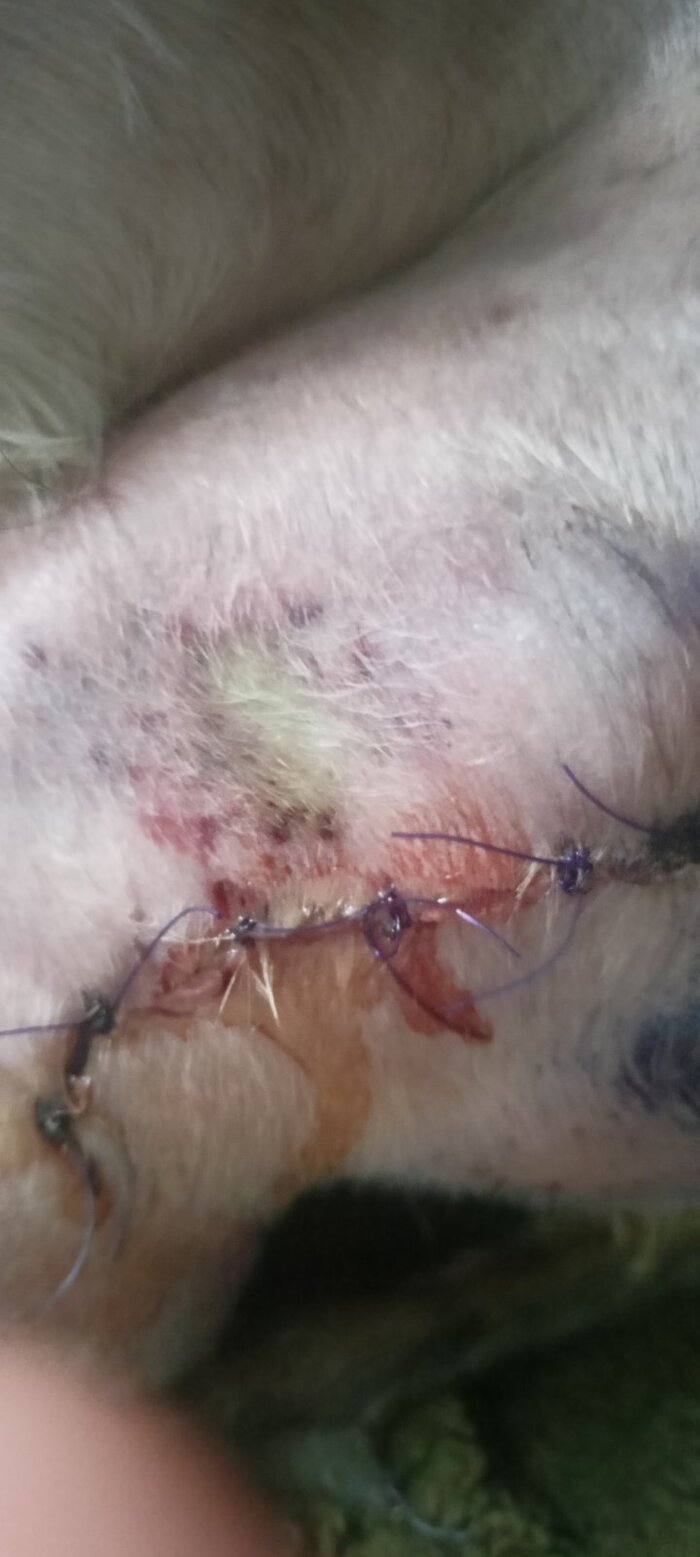 Здравствуйте! Нужна помощь с собакой. Сука, метис стаффа и фр. бульдога, 5 лет, 21 кг, стерилизована, привита, глистогонка проведена. Внезапно 21.04 начались боли в животе спастического характера. Вечером пришли с работы, увидели необычное поведение и явные спазмы. Стул, диурез в N, рвоты не было. Отвезли в ту ветклинику, которая согласилась принять прямо сейчас. Температура N, глюкоза 2,3, укололи в 18.00 бициллин 4,0+флексопрофен2,2+гепосейф2,2. С собой дали анальгин 0,5+папаверин 1,5+аллервет2,5. Через 30 минут стало лучше, появились эмоциональные реакции. В 3.30 ночи снова спазмы, прошло само. В 6.30 спазмы с воплями, уколола анальгин+папаверин+аллервет. В 8.30 нашла клинику, где согласились принять без записи и сделать УЗИ ОБП. Взяли кровь на ОАК и расширенный БАК(результат будет 24.04), сделали УЗИ, протокол не выдали, на словах немного увеличена печень, поджелудочную нормально посмотреть не удалось из-за гипертонуса брюшных мышц. Укололи витам, серения, синулокс. С собой дали амоксициллин+ что-то с В12(предположительно, ярко-розовый раствор в шприце)+что-то ещё (не запомнила), сказали уколоть это 23.04 утром. В 20.00 снова сильные боли, дала но-шпу per os, 80 мг, на 2 часа стало легче. Аппетит сохранен, на еду кидается, как никогда, обычное питание - сырая промороженная натуралка+10% овощей. По рекомендации второй клиники стала кормить подваренным мясом. После еды становится хуже примерно на час. После стула состояние явно облегчается. Что делать дальше? Собаке очень больно, учитывая её высокий болевой порог (не реагирует на уколы вообще никогда), а в моменты спазма скулит, трясётся и пытается спрятаться. У меня медицинское образование, в общей биологии-физиологии разбираюсь, в ветфармацевтике вообще никак.