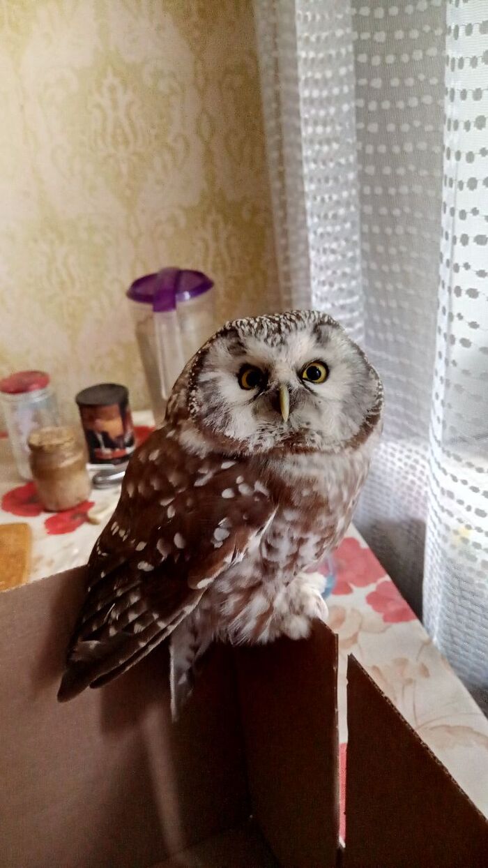 Благодаря Пикабу один из ребят, увидев сыча у знакомой, понял, что с ним что-то не так, и связался со мной. Этот же человек настоял, чтобы сыча хозяйка передала мне.