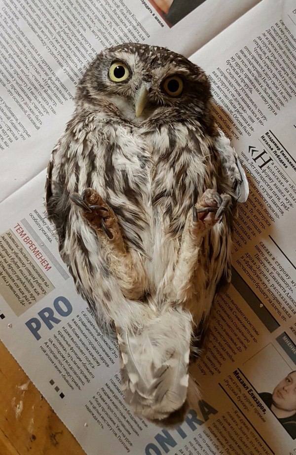 Пипец - дикий домовый сыч, проданный браконьерами людям в качестве "ручной милой птички". По незнанию он был доведён до состояния близкого к критичному. Не без помощи Пикабу, точнее, одного из моих подписчиков, хозяева сыча узнали о том, что птицу срочно надо передавать специалистам, и связались со мной. (я очень рада, что мои посты служат не только развлечением или "красной бычьей тряпкой" для некоторых, но и приносят реальную просветительскую пользу, спасая жизни птицам).
