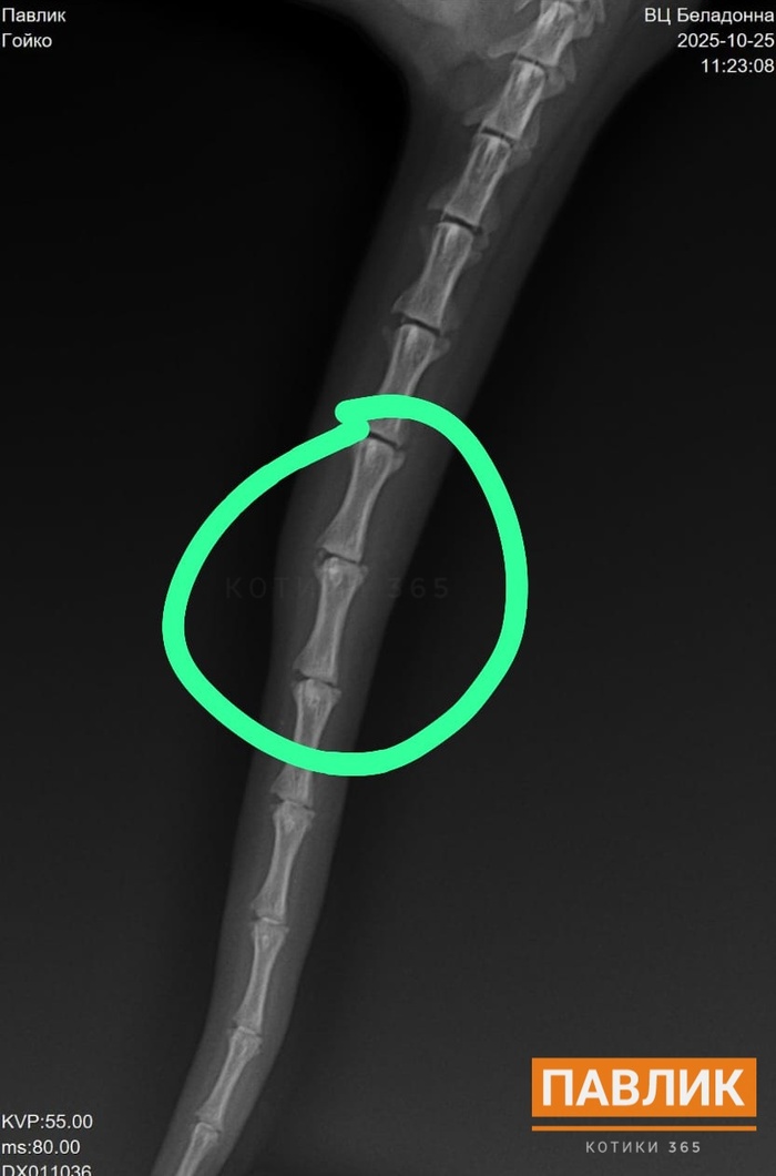 На коже есть ссадина. Есть небольшое смещение позвонков. Не перелом. Не укус. Похоже Павлик где-то прищемил хвост. Не опасно.