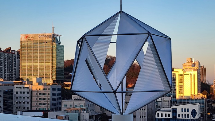 Южнокорейский стартап GeoWind представил городскую ветряную турбину в форме икосаэдра — правильного многогранника из 20 одинаковых равносторонних треугольников. Эта фигура была впервые описана Платоном как обладающая идеальной геометрией: все грани одного размера, все ребра одинаковой длины, все углы равны. Такая форма обеспечивает конструкции высокую прочность, устойчивость к нагрузкам и равномерное распределение сил.
