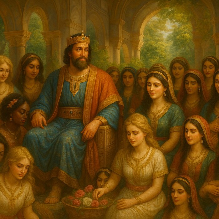 Соломон, несмотря на свою мудрость, собирает огромный гарем, где многие жёны – это политические союзы, а не любовь. Он позволяет своим жёнам поклоняться идолам, строит для них капища, что приводит к отходу от Бога и, в итоге, к расколу царства после его смерти. Жёны, в свою очередь, лишены индивидуальности: их имена почти не упоминаются, а их роль сводится к статусу или инструменту власти. Соломон, кажется, любит больше идею обладания, чем самих женщин, а они, вероятно, живут в конкуренции и эмоциональной пустоте.