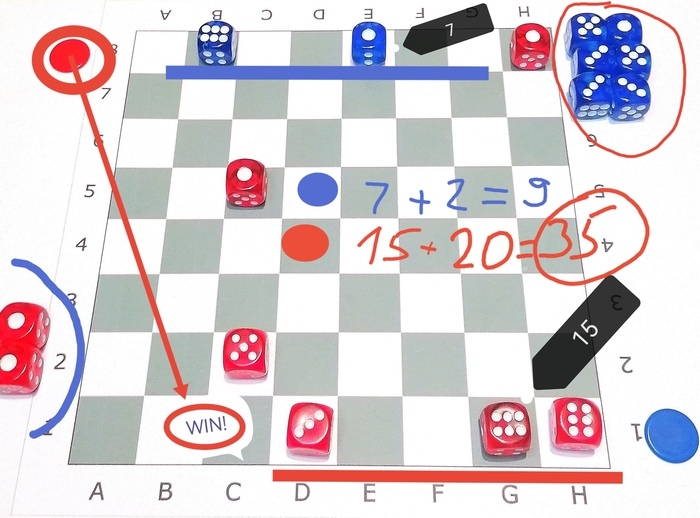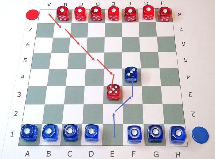 11. **Завершение игры**: Игра заканчивается, когда все кубики одного из игроков достигнут стартовой линии соперника, независимо от их количества на игровом поле в данный момент.