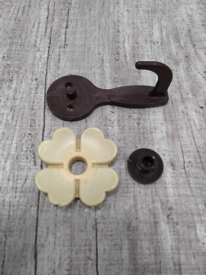 У нас был похожий, так сказать, расширенный набор, назывался "Интерьер". В него входили: четыре "цветочных" крючка, настенный держатель "крокодил" для вешалок, десяток прищепок - клипс, клей, шурупы.