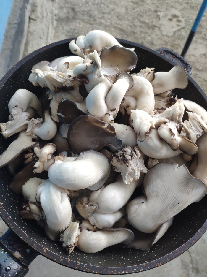 Эти вешенки сверху чем то напоминают вольвариеллу. И только заглянув под шляпку можно увидеть,что не она. А так, сверху, похожа.