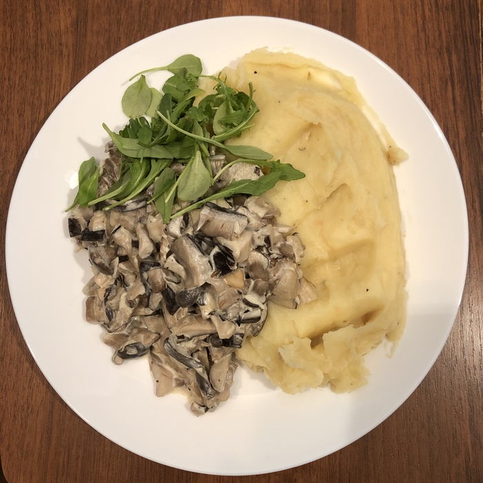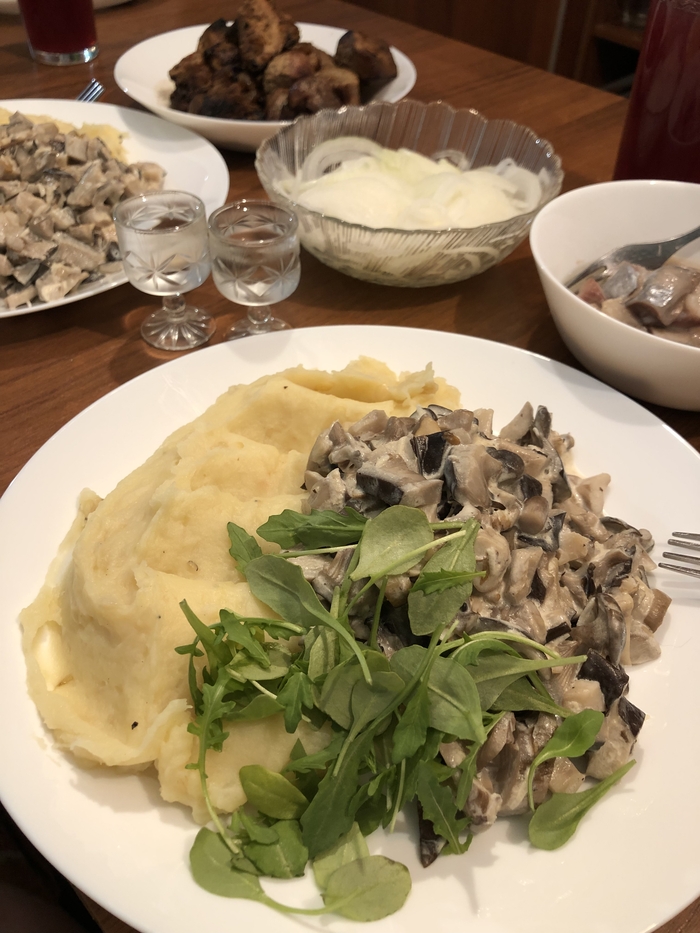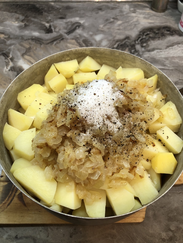 Опасаясь за то что грибы будут сожраны без картошки, пюре отвариваем заранее. У меня получилось картофельное пюре с жареным луком.