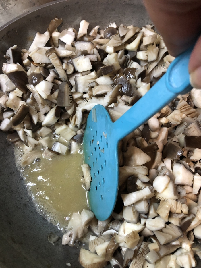 Грибы жарить я решила на сливочном масле, закинула в сковороду грибочки и помешивая дождалась когда из них выпарится вся лишняя жижа.