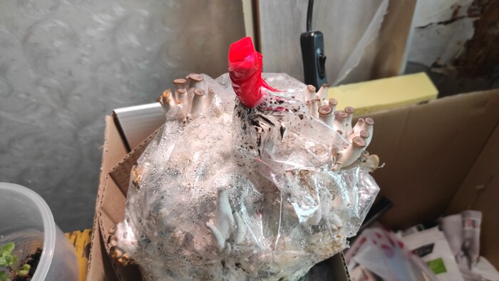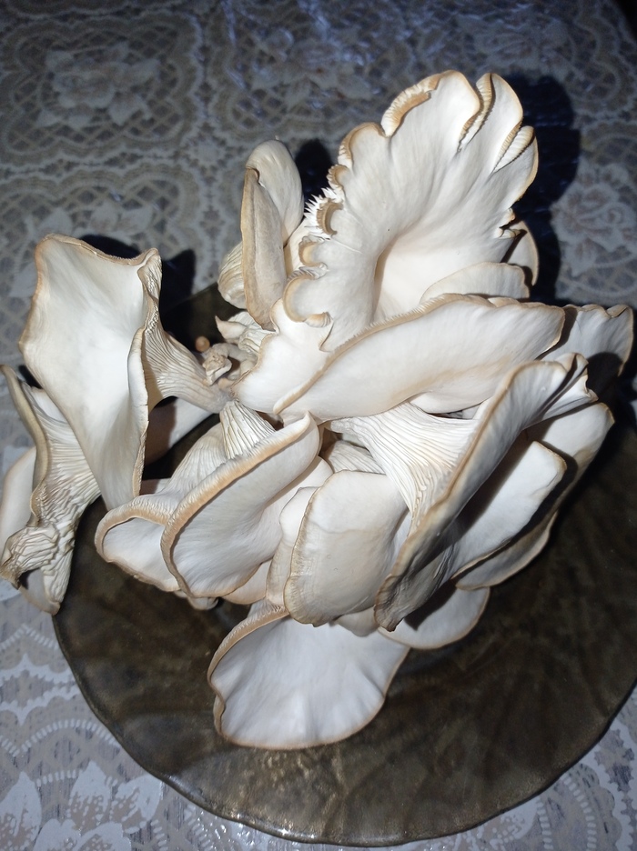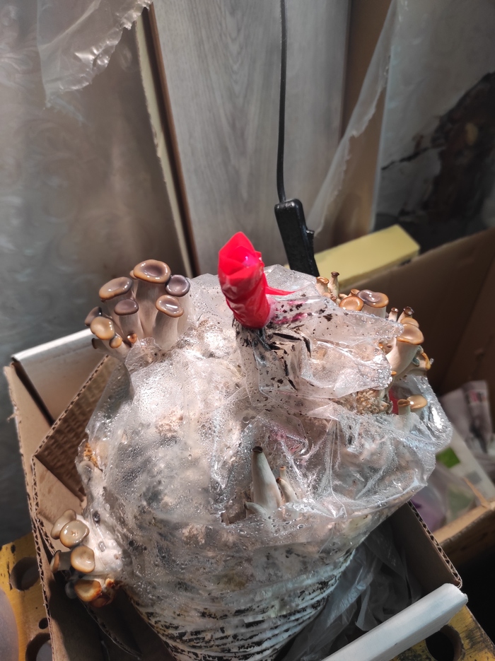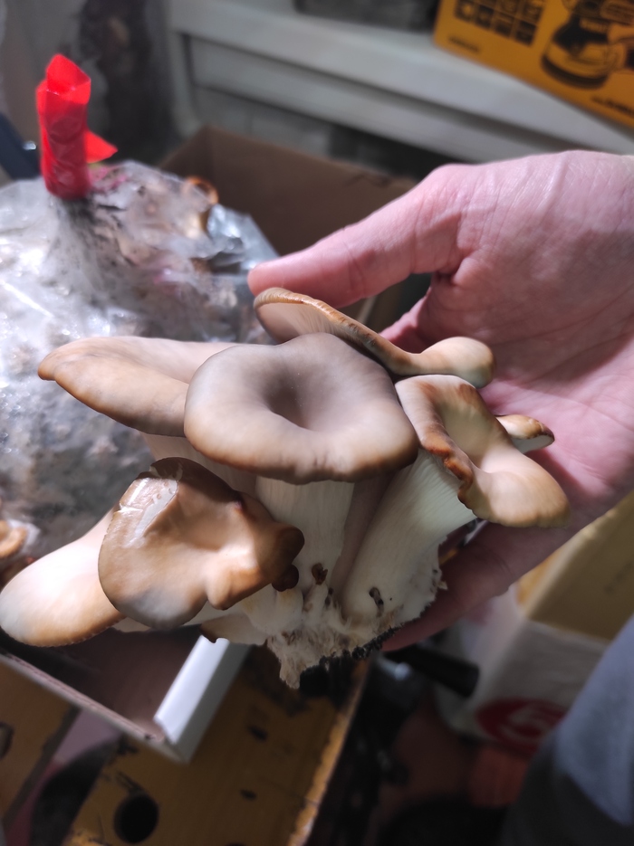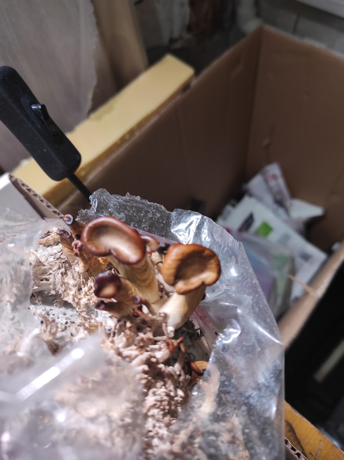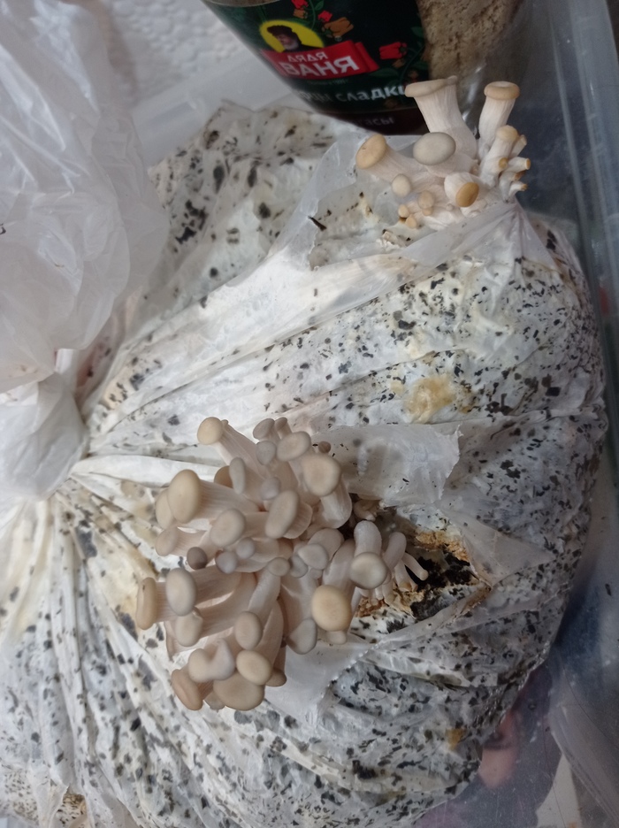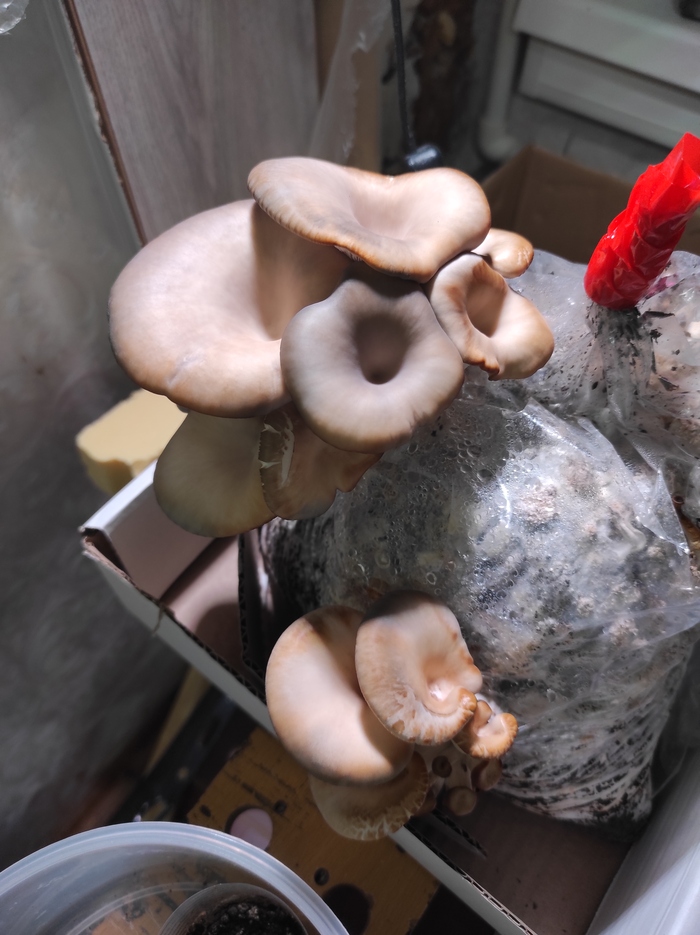 Я точно убедилась, что мы таки взяли Королевские вешенки, а не другой их вид (думала на Чёрный принц). Сейчас очень любопытно, как поведёт себя вторая крупная гроздь грибов: станет развиваться активнее или начнёт отсыхать. Так же интересно посмотреть, будет ли следующая волна после периода покоя. Перед периодом покоя хочу сменить грибнице мешок и положить её на бок, сделать 1 отверстие для выхода плодовых тел, чтобы избежать котовасии со стихийными формированиями микрогрибочков во всех местах и их последующим отсыханием.