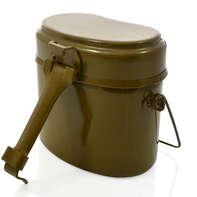 Солдатский (походный) котелок. При раздаче пищи в полевых условиях (приготовлена на полевой кухне) повар первое блюдо наливает собственно в котелок, а второе блюдо и пайку хлеба накладывает в крышку. При приготовлении еды военнослужащие объединяются по двое: в одном котелке варят первое блюдо, в другом — второе. Второй котелок также используется для приготовления чая. ссылка