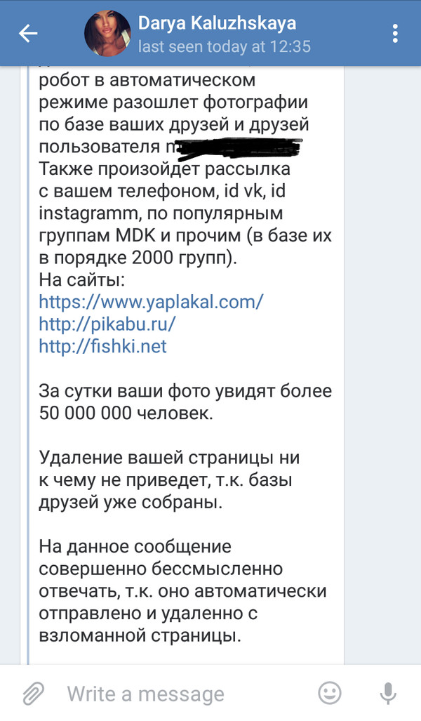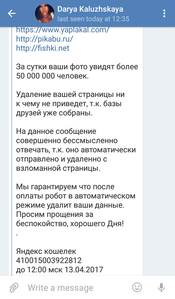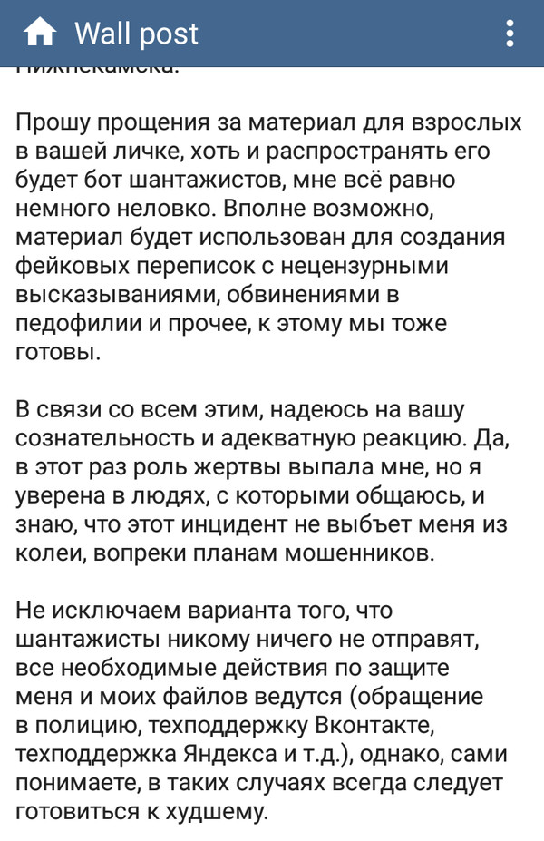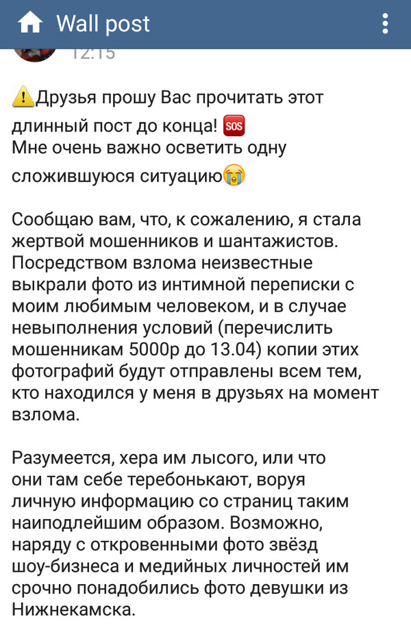 Перечислять средства, разумеется, не будем, и морально подготовили друзей постом, скрины которого идут следом за сообщением шантажистов.