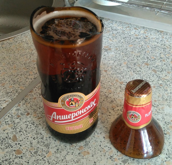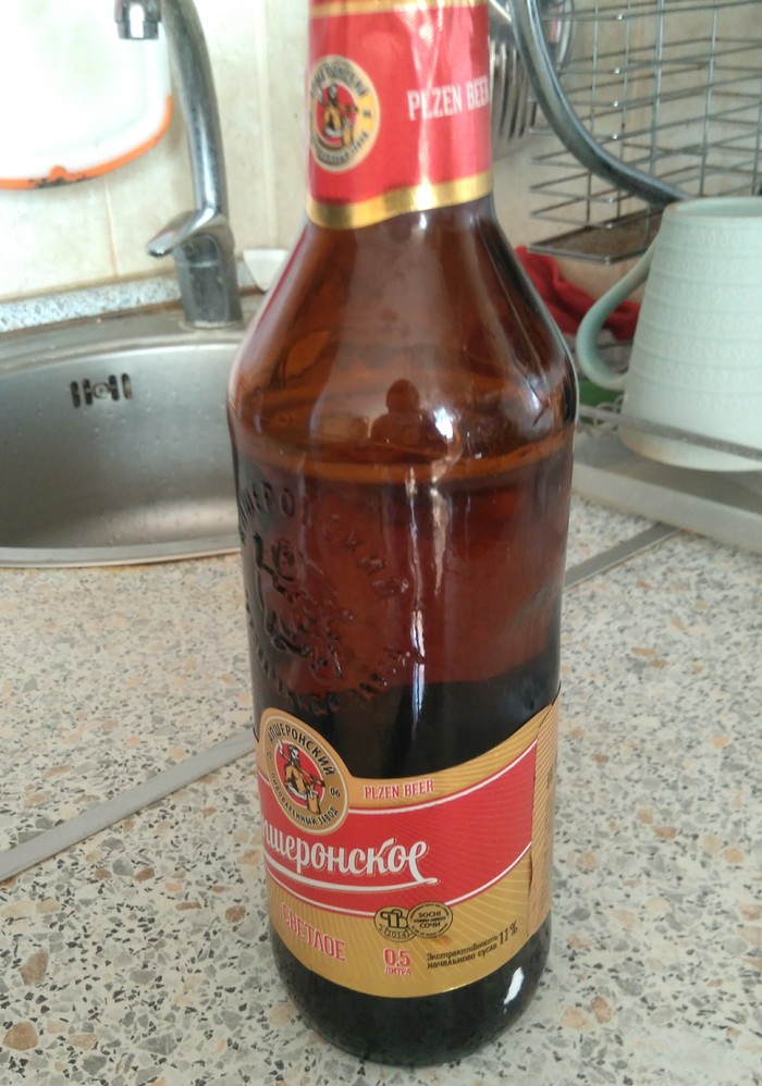 Готовлю сейчас ужин, а в углу поставил пару бутылочек пенного, на вечер. Не успел ещё в холодильник убрать. Тут как бахнет, звук и состояние в тот момент не описать, испугался прилично. Часть бутылки подлетела на метр, не меньше. Странно что ещё упала и не разбилась, возможно на пробку. Хорошо стекла по кухне не разбросало, т.к. к бутылке прикладываю ровно так входит. Следующее фото. Вроде не просроченное.
