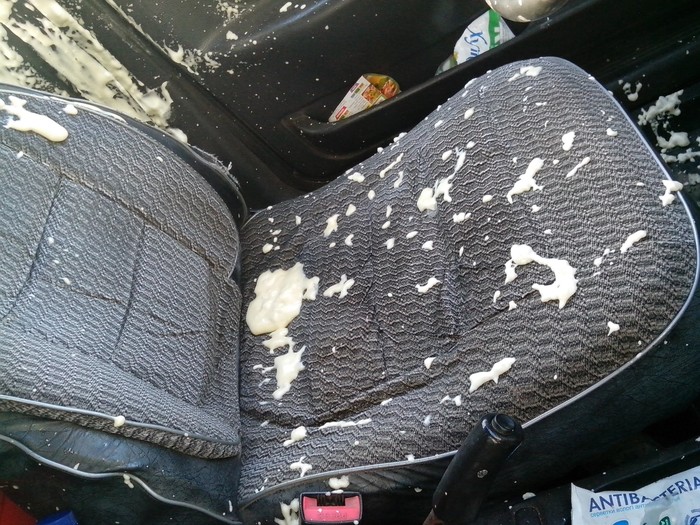 Работали как-то с товарищем. Взяли с собой на монтаж два баллончика пены: один начатый, а второй целый. Оставили оба в машине, в культуре под водительским сиденьем. А солнышко припекало знатно, температура на улице под 30 градусов. А в машине закрытой вообще ад! И вы, наверное, догадались, что произошло! Балон пены, который целый не выдержал и взорвался!!!! Это был пиздец!! Кулёк, в который были баллоны замотаны не помог, совсем! Весь салон в этой гребаной пене! Которая засохла очень быстро. А самое противное то, что увидели мы это только в конце дня, когда собрались уезжать. Вот такая х...ня, малята! А начатый баллон нормально перенес жару, вот.