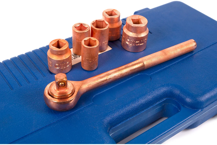 Набор торцевых головок представлен в оптимальной комплектации и содержит популярный размерный ряд. Используется в автомастерских для обслуживания резьбовых соединений. Инструмент поставляется в прочном кейсе для надежного хранения и удобной транспортировки. Покрытие инструмента медное, толщиной 30-50 мкм, выполнено электрохимическим способом. Омедненное покрытие позволяет применять его на территориях и помещениях с высокой пожаро-взрывоопасностью. Стоит набор 10 600 руб. Ссылка на него