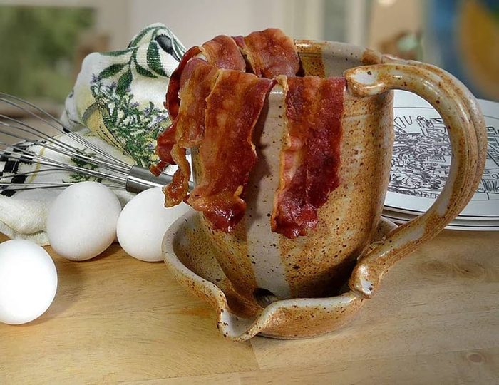 Это кружка для готовки бекона, в микроволновке или печи. Жир стекает в блюдце, можно вылить. Или применить где-либо.