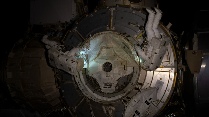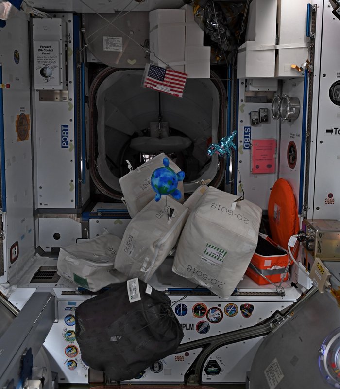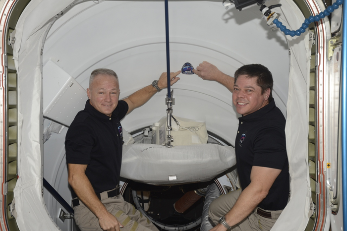 На втором снимке астронавты наклеивают эмблему SpaceX DM-2 на адаптер PMA-2 модуля «Гармония»
