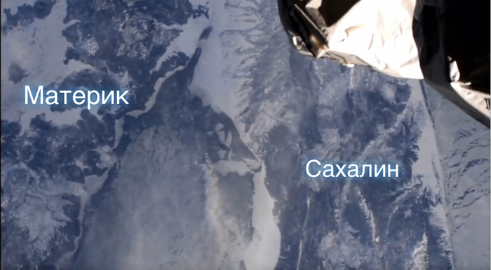 Космическая станция пролетела над самой узкой частью Татарского пролива, где материк находится на минимальном расстоянии от острова.