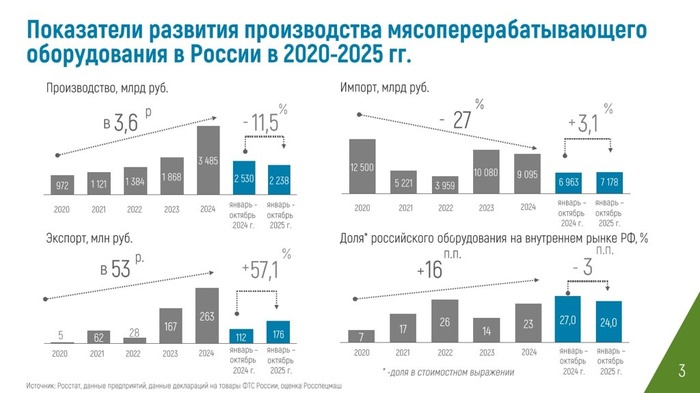 Выпуск мясоперерабатывающего оборудования в России за 10 месяцев текущего года снизился в денежном выражении на 11,5%, до 2,4 млрд рублей. Экспорт увеличился на 57% - до 176 млн рублей, а доля на внутреннем рынке российских заводов снизилась на 3 п.п. - до 24%. Тем не менее компетенции отечественных производителей растут, и уже охватывают такие направления, как выпуск оборудования для убоя, обвалки, измельчения, сепарирования, упаковки, приготовления фарша, поддержания гигиены. В РФ производятся термокамеры, упаковочные вакуумные машины, волчки, оборудование для выращивания свиней, КРС, птицы и прочие машины. Наши предприятия осваивают новые перспективные направления, такие, как, например, разработка высокопроизводительных линий по выпуску полуфабрикатов, линий нарезки, убоя, инъектирования и шприцевания.