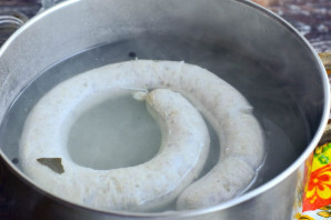 Отварите колбасу в течение 20 минут в воде, добавив в нее лавровый лист, перец горошком и 1 чайную ложку соли.