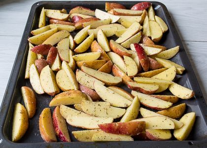Отправляем в предварительно разогретую до 220 градусов духовку и запекаем до готовности. Точное время будет зависеть от конкретного сорта картофеля. Красный картофель, как у меня на фото (ред скарлетт) печется у меня примерно 30-40 минут.