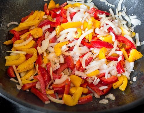 Жарим, помешивая, 5-7 минут, до готовности лука и мягко хрустящего состояния перца. В конце добавляем мясо, острый соус, лимонный сок и цедру, сухие травы. Солим по вкусу, прогреваем в течение пары минут и снимаем с огня.