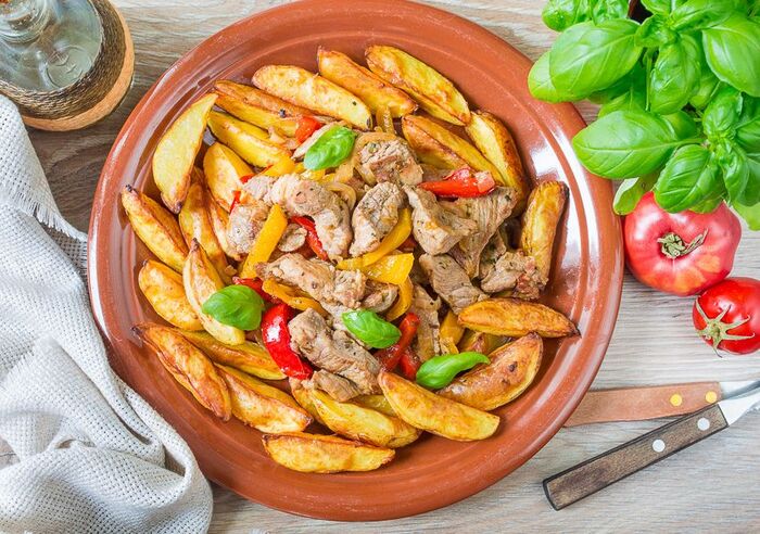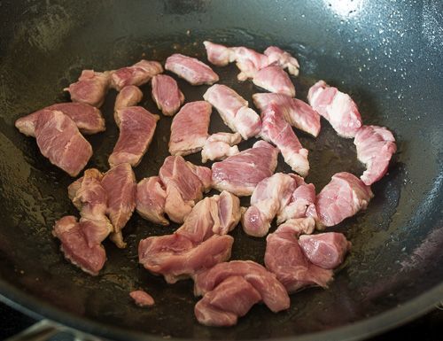 Пару раз в процессе запекания ворочаем картофель лопаткой. Мясо нарезаем на небольшие тонкие кусочки. В несколько заходов обжариваем до готовности на средне-сильном огне.