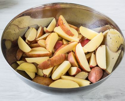 Картофель тщательно моем, кожу не счищаем. Вытираем насухо и нарезаем на дольки. В зависимости от размера картофелин я режу их на 6-8 частей, если пеку мелкий, то либо оставляю целым, либо режу на половинки. Помните, что чем мельче нарезка, тем быстрее пропечется картофель.