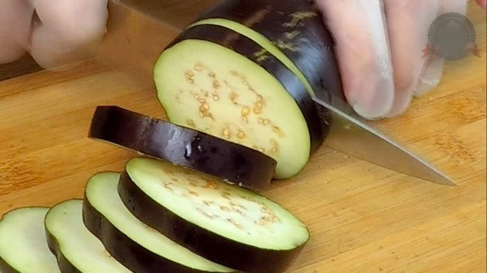 Баклажан не чистим, нарезать так же на кружочки толщиной 1 см.