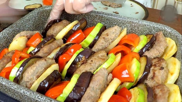 Формируем Рататуй. Выложить в жаропрочную форму кружочки картофеля, котлету, баклажан, кабачок и перец. Затем опять кружочек картофеля, котлету, баклажан, кабачок и перец. И так по всей форме. На этом этапе можно поставить духовку на разогрев на 200 градусов.