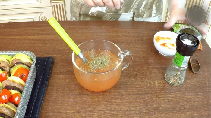 В стакане с теплой водой объемом 200-250 мл.смешать пол ч.л. сахара, томатный кетчуп или соус, приправы, соль по вкусу и хорошо перемешать. Залить смесью Рататуй.